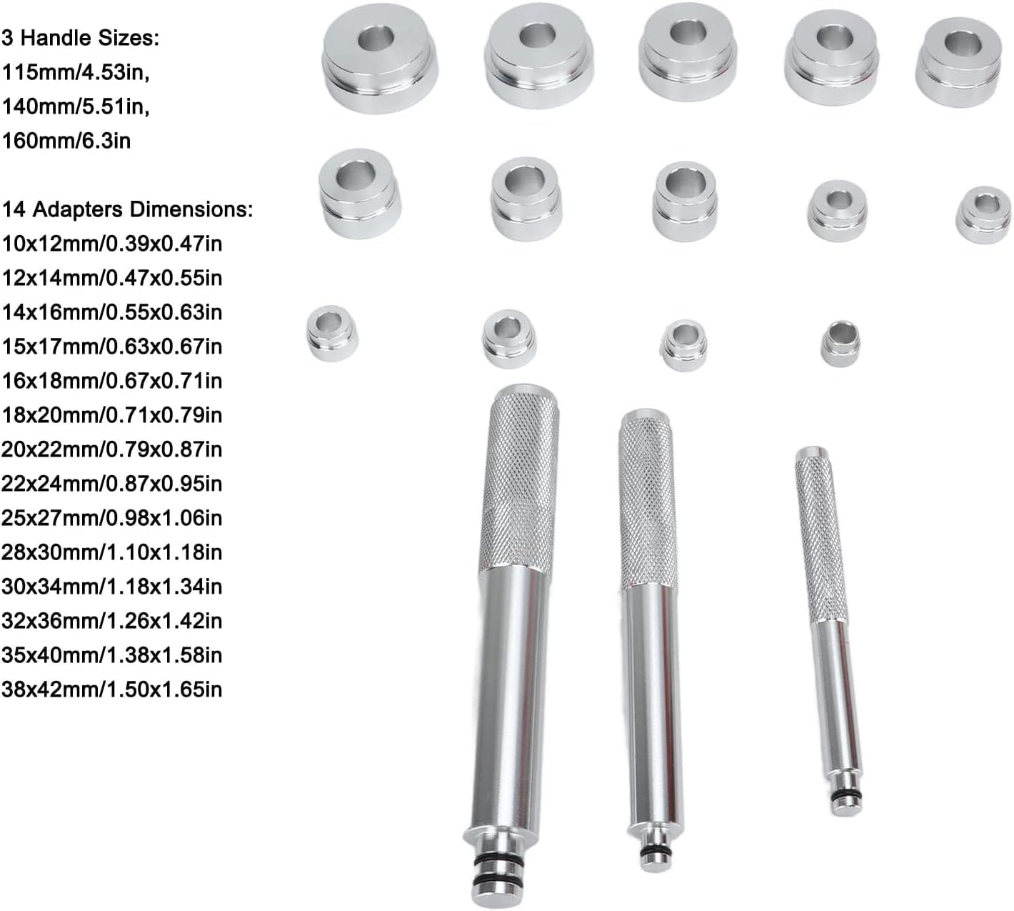 Our store is a store that specializes in outdoor products, electronics, car and motorcycle accessories, and security accessories. Our philosophy is to provide you with good quality products to make you and your life more convenient. Specifications:Item Type: Bushing Driver Tool SetMaterial: Aluminum Alloy 3 Handle Sizes: Approx. 115mm/4.53in, 140mm/5.51in, 160mm/6.3in14 Adapters Dimensions:10x12mm/0.39x0.47in12x14mm/0.47x0.55in14x16mm/0.55x0.63in15x17mm/0.63x0.67in16x18mm/0.67x0.71in18x20mm/0.71x0.79in20x22mm/0.79x0.87in22x24mm/0.87x0.95in25x27mm/0.98x1.06in28x30mm/1.10x1.18in30x34mm/1.18x1.34inx36mm/1.26x1.42in35x40mm/1.38x1.58in38x42mm/1.50x1.65inFitment: Universal for Cars and Motorcycles Package List:1 x Bushing Driver Tool Set4 x Rubber Ring1 x Storage Box