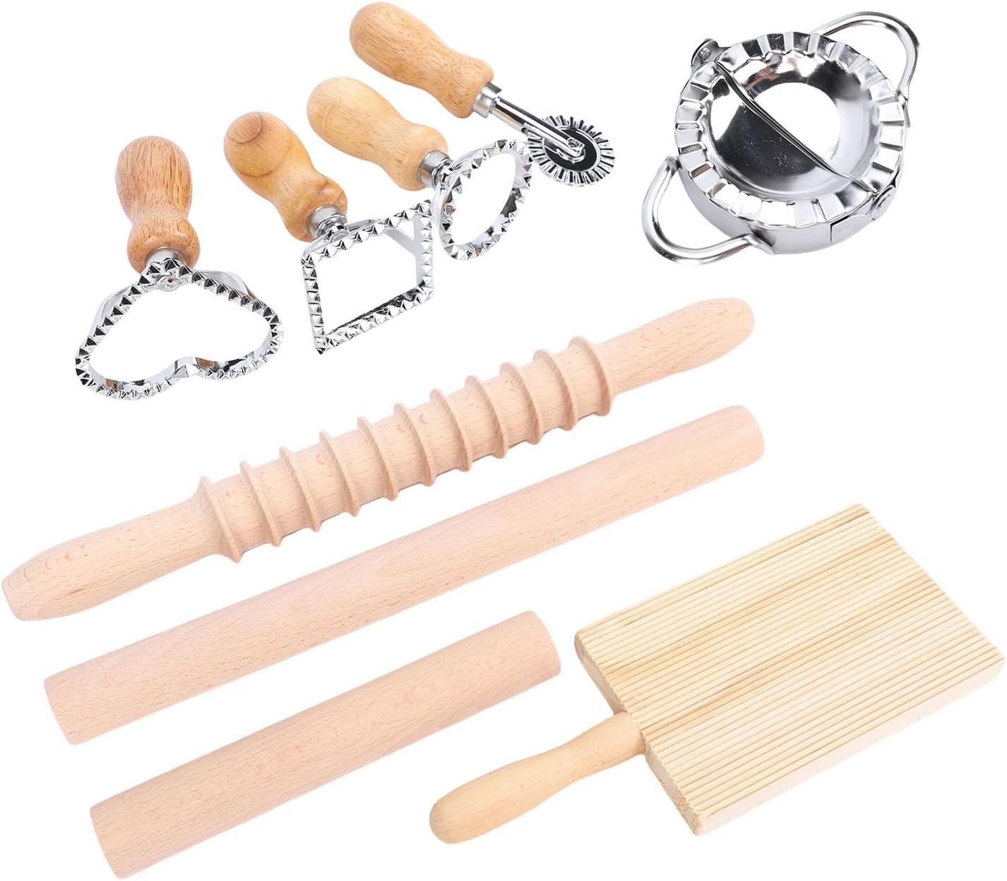 Feature: 1. Stainless Steel Wood Materials: Crafted from premium stainless steel and beech wood, the gnocchi pasta making tools kit is sturdy, damage proof, and dependable for use. 2. Secure Sealing: The ravioli stamp design ensures that your dumplings have tightly sealed edges, preventing any filling from leaking during the cooking process. 3. Efficient Rolling: Equip yourself with the practical rolling pin that makes it easy and efficient to roll out even, uniform pasta sheets for wonderful Italian meals. 4. Comfortable Grip: The wooden handles provide a comfortable grip, making these tools ideal for family use, so you can enjoy crafting delicious pasta with friends and family. 5. Versatile Use: Whether making pasta, dumplings, cookies, or other pastries, this kit meets diverse culinary needs, offering a complete solution for enthusiasts. Specification: Item Type: Gnocchi Pasta Making Tools Kit Material: Beechwood, Stainless Steel Weight: Approx. 803.00g / 28.33oz Gnocchi Board Size: Approx. 21x9cm / 8.3x3.5in. Package List: 1 Set x Pasta Making Tools (Including 9 Accessories)